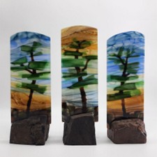 Nancy Hemstad Seaton is a glass artist who has been creating her entire life. “It’s breathing.”  She finds the physicality, technicality, fluidity and solid intense color of glass inspiration. “Together we express our feelings in a duet. It’s science and heart. Chemistry creates the colors; physics the shape.” Nancy creates functional pieces, such as plates and bowls, as well as jewelry and sculptural towers. She discovers that some of her pieces are straightforward coming out of the kiln exactly as planned. “In others I’ll put reactive colors together or let gravity and heat move things around.” Nancy and her husband live on the Gunflint Trail, “where the calm of a sunset or the power of a towering White Pine stir me to share that moment’s emotion.”